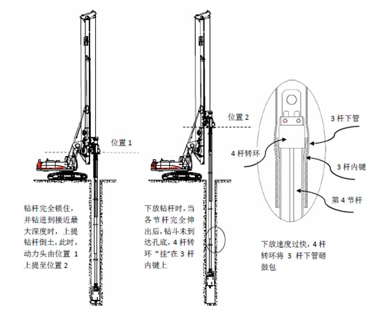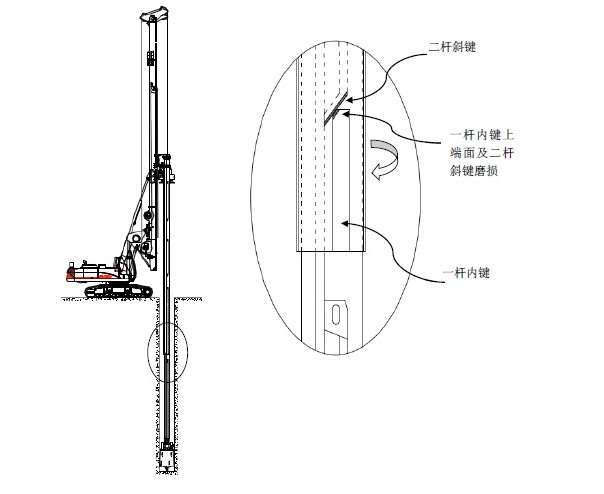 3、下放鉆桿過程中,在相鄰兩節(jié)桿接觸時沒有緩沖,導(dǎo)致內(nèi)層桿轉(zhuǎn)環(huán)與外層桿內(nèi)鍵沖擊,將外層桿下管處撐鼓包。