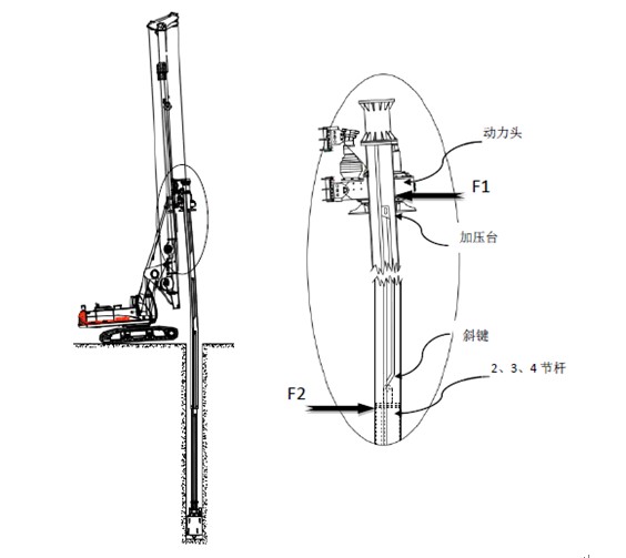 2、作業(yè)過程中主機前履帶翹起,桅桿后背,第1節(jié)桿受動力頭向后的力F1,內(nèi)層各節(jié)桿保持豎直的力F2,兩力形成力矩將第1節(jié)桿瓣斷。第1節(jié)桿*上面一組加壓臺及斜鍵間*容易被瓣斷。